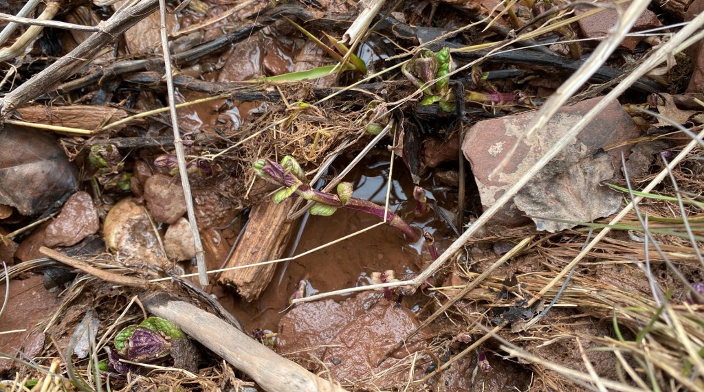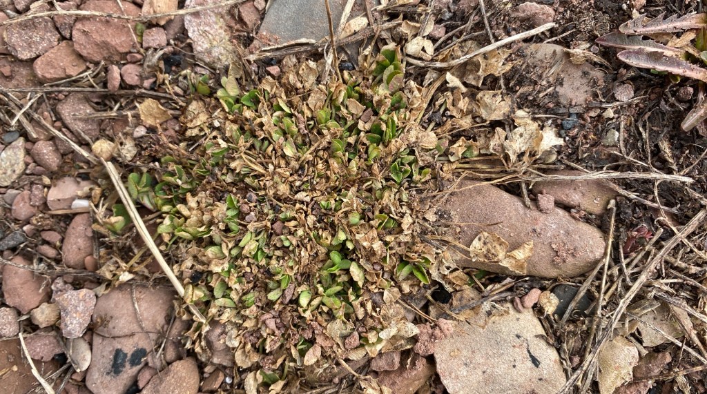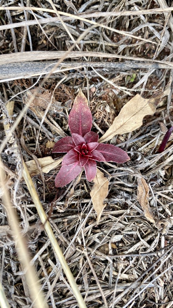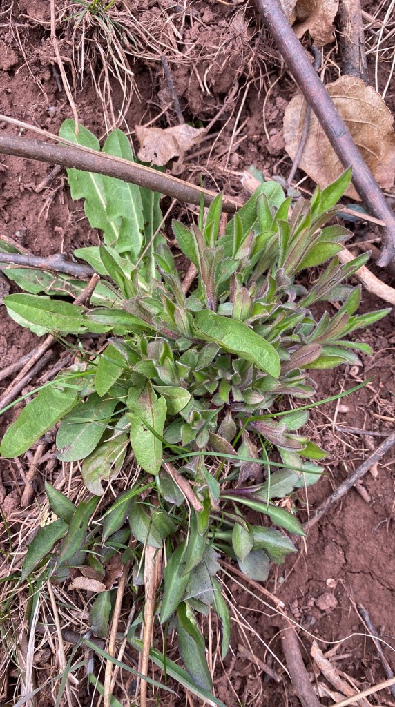 J’ai commencé en constatant une belle onagre bisanuelle qui pointait du nez. Il y en avait plusieurs, en fait, toutes petites, ça pousse rouge au centre, mais c’est bien vivant.