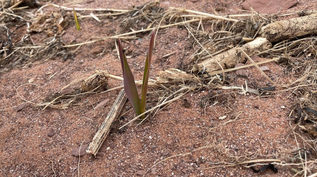 Puis, ci-haut, des brins que je n’arrive pas encore à identifier, qui sortent du sable rouge. Ça pourrait être du gourbet, de l’ammophile, je ne sais pas trop.