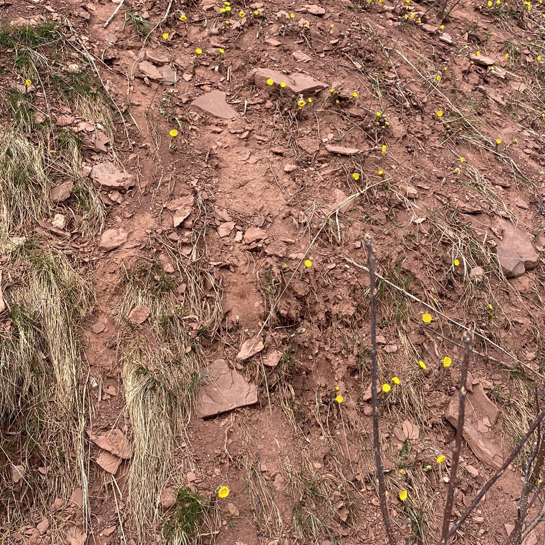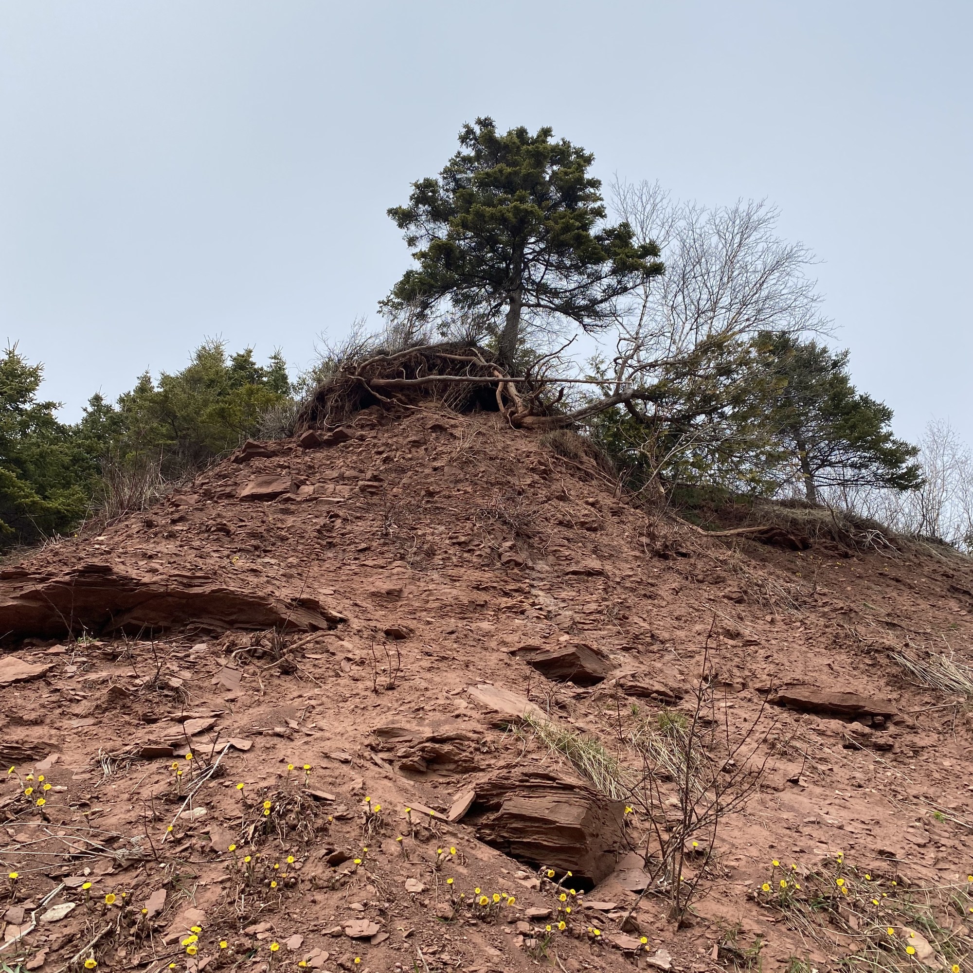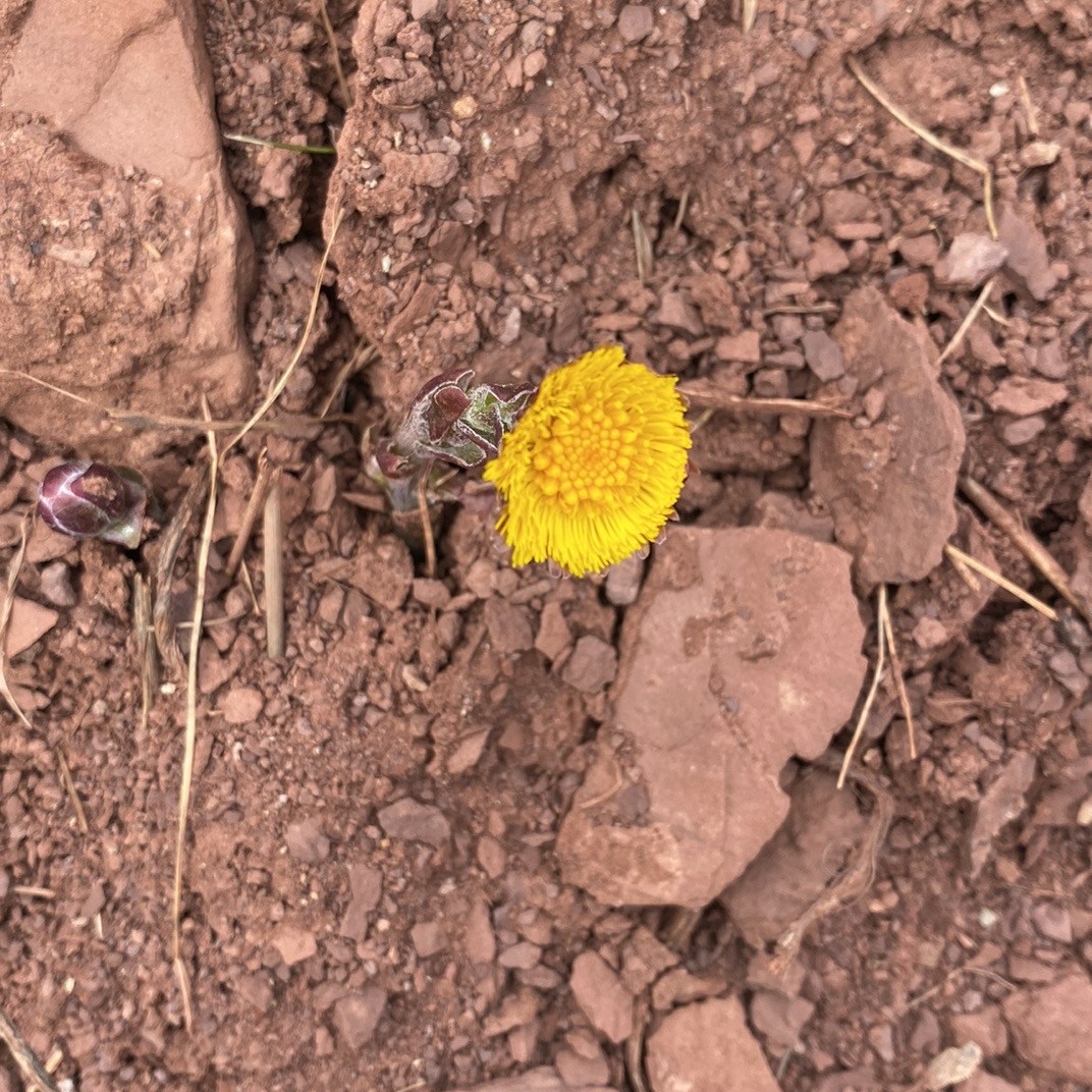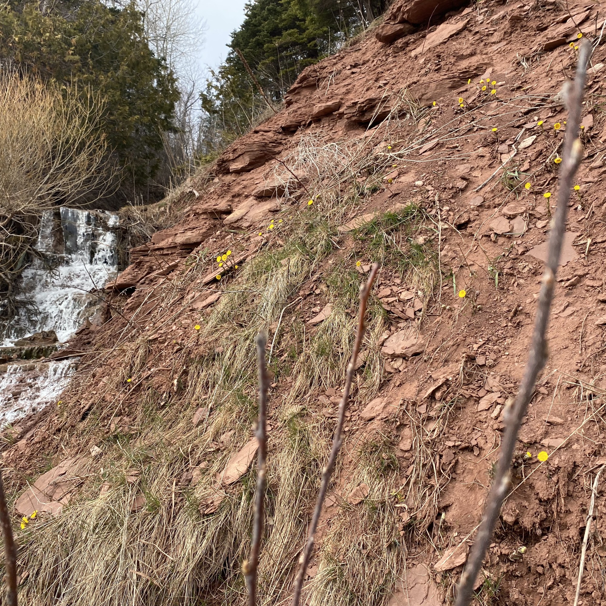 Ma surprise du jour, c’est vraiment les falaises toute ensoleillées de tussilage. Le tussilage a probablement commencé à fleurir il y a quelques jours seulement, mais elle recouvrait toute la falaise Le Boutillier et c’était vraiment un beau spectacle avec la chute juste à côté.