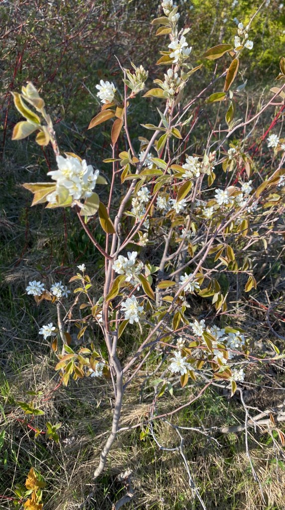 Le clou du spectacle, pour moi, c’est de penser que l’amélanchier est en fleurs… sa fleur dure longtemps, car deux semaines après, il était toujours fleuri (j’écris cet article à posteriori!)